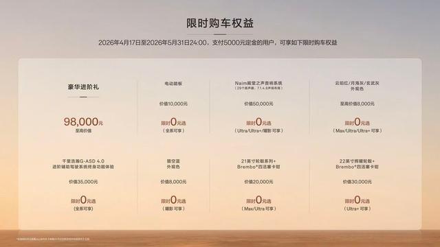 六重购车礼: 包含现金直减、价值至高 9.8 万元的“豪华进阶礼”(含 29 扬声器 Naim 殿堂级音响系统、电动踏板等限时 0 元选装)以及 8 项限时选装礼。