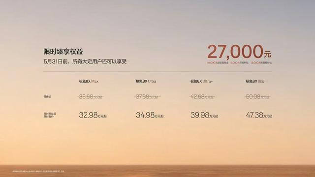 极氪 8X 系列公布了零售价与限时权益价(限 2026 年 5 月 31 日 24:00 前定购),全系享受 2.7 万元现金直减。除价格下探外,官方还提供了极其详尽的限时购车礼遇: