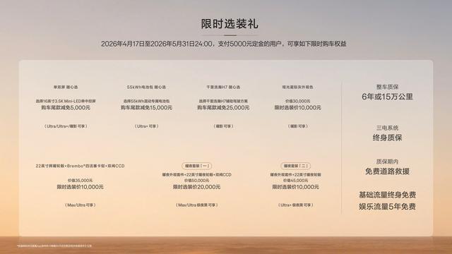 “随心选”尾款减免: 官方提供了灵活的配置方案选择。曜影版选装 H7 智驾方案可减免 25,000 元;Ultra+ 版选装 55kWh 电池可减免 15,000 元;选装 16 英寸中控单屏可减免 5,000 元。